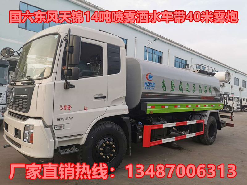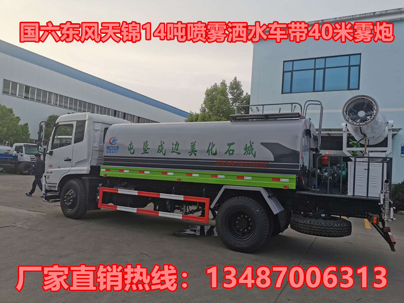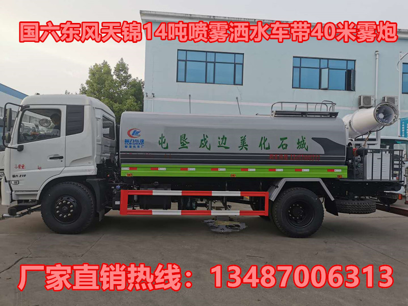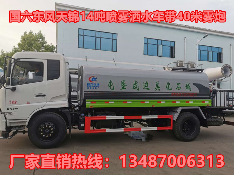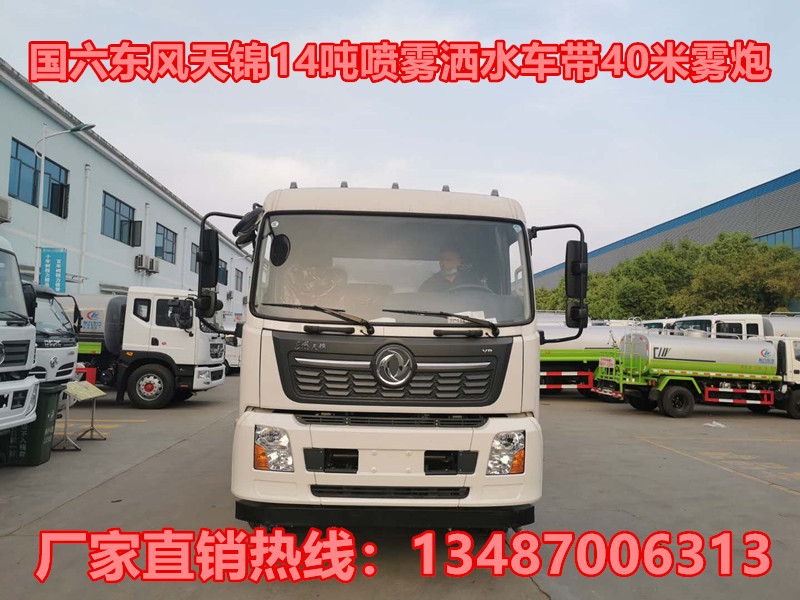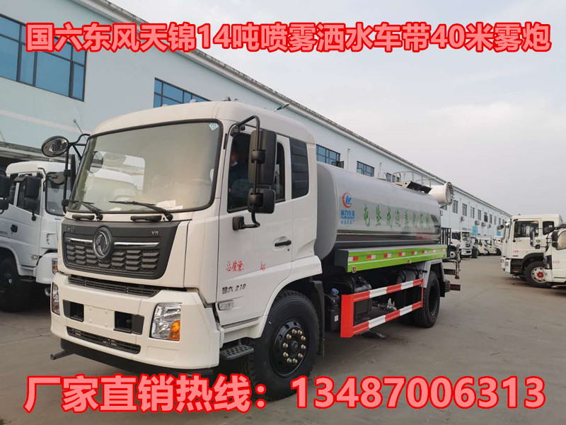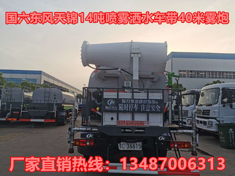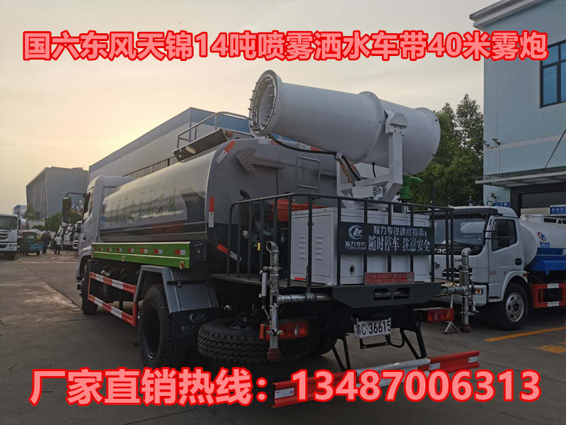 國六東風天錦14噸噴霧灑水車配40米霧炮專用功能為:前沖,后灑,側噴,罐體后帶工作平臺加護欄,平臺上安裝綠化灑水高炮,射程28米左右,可調節多種形態(大雨、中雨、霧狀),配備大功率專用灑水泵,泵可吸自排,帶自流閥,帶消防接頭,帶過濾裝置,兩根吸水管。另外該車可選裝A、后部帶弧形噴霧;B、后部帶LED箭頭指示燈;C、后部帶弧形噴霧裝置;D、后工作平臺加裝噴霧機組;E、氣控閥門駕駛室內操縱灑水車灑水功能